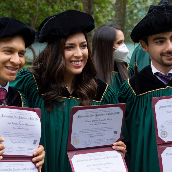 El evento de graduación dio inicio con el discurso de Diego Quiroga, rector de la USFQ, quien aplaudió y reconoció a los familiares de los graduados por la confianza depositada en la Universidad y por haberles brindando el apoyo necesario para la culminación de este gran reto profesional. Hugo Burgos, decano del Colegio de Posgrados, se unió a estas felicitaciones y recalcó que la educación en artes liberales es la que fortalece la resiliencia de la comunidad USFQ.
